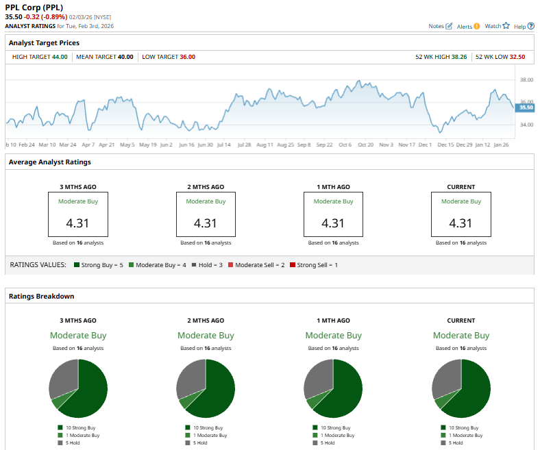 The consensus rating among the 16 analysts covering PPL stock is a “Moderate Buy” overall. That’s based on ten “Strong Buy” ratings, one “Moderate Buy,” and five “Holds.”