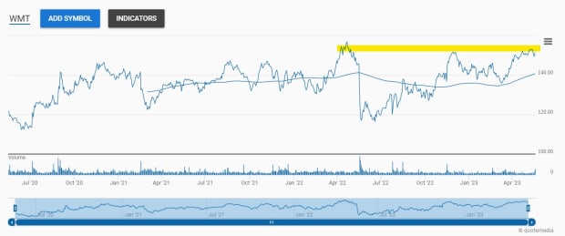 Walmart stock has marched steadily higher since mid-March. It’s now bumping against resistance at its December highs near $154. If it can clear this hurdle, then there’s more resistance at near $160 – its all-time high set in April 2022 before it reported disappointing results caused by supply disruptions and too much inventory.
