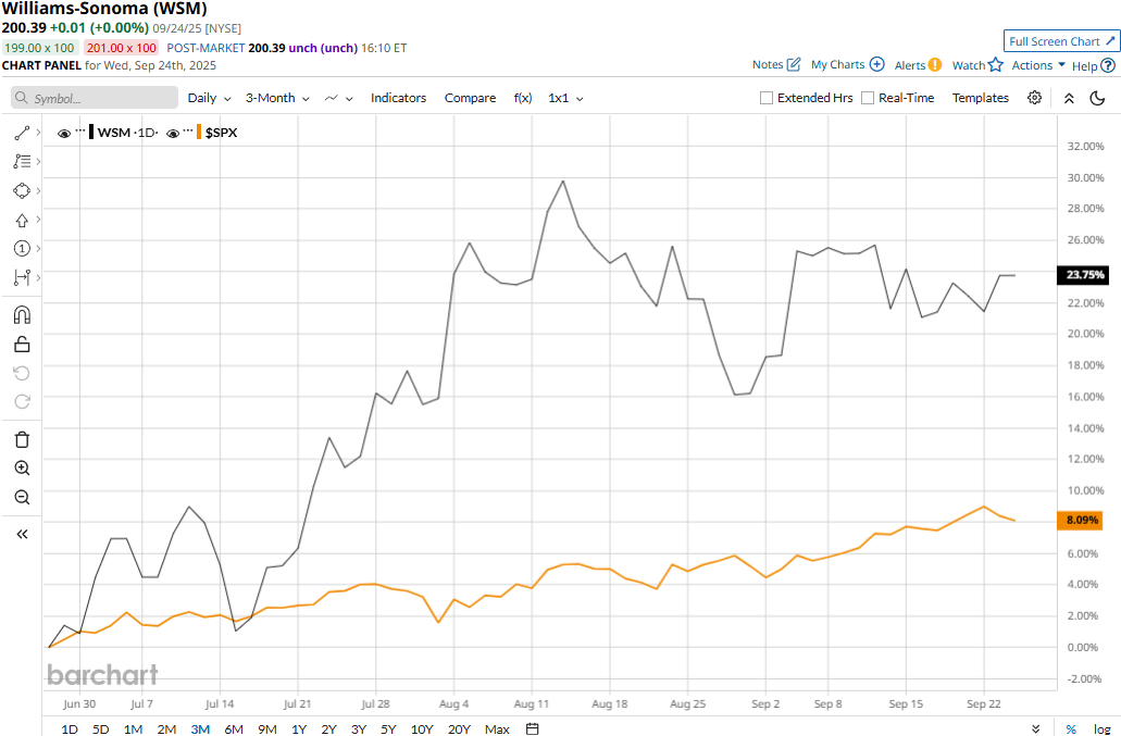 Williams-Sonoma’s performance has remained mixed over the longer term. The stock has gained 8.2% in 2025 and surged 31.2% over the past 52 weeks, lagging behind SPX’s 12.9% gains on a YTD basis, but substantially outpacing SPX’s 15.8% returns over the past year.