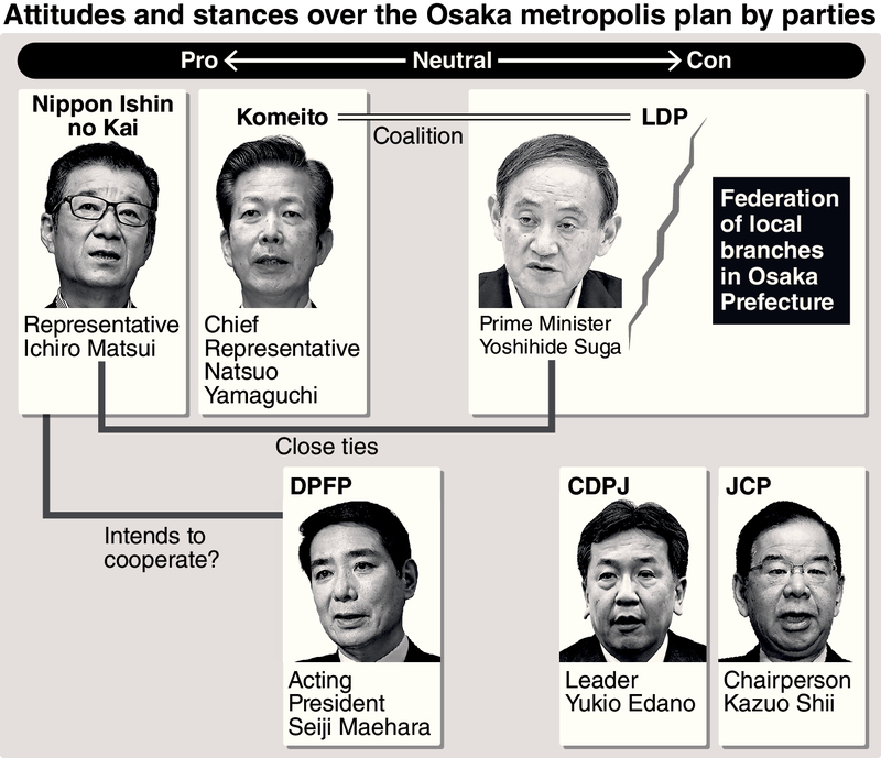 Prime Minister and LDP President Yoshihide Suga has long maintained close ties with Matsui. "We recognize that [the purpose of the metropolis plan] is to eliminate double administration," Suga admitted. When a senior official of the LDP's Osaka prefectural federation visited the prime minister's office on Thursday, Suga did not express approval or disapproval of the plan, saying only, "Good luck."
