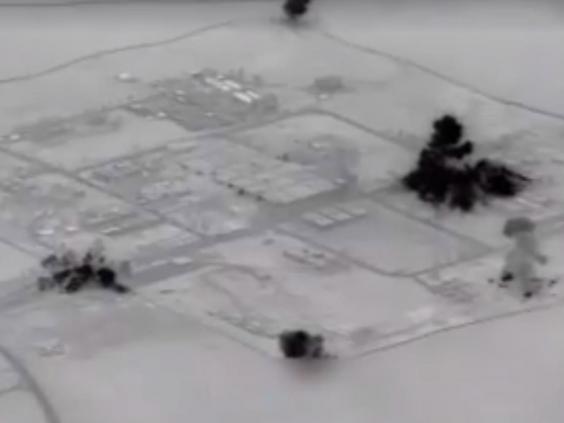 Huge explosions could be seen hitting multiple buildings and storage units, leaving them in flames with large plumes of smoke rising into the air.