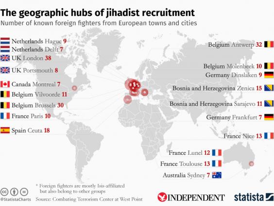 The CTC’s analysis, which used only a small sample of the tens of thousands of foreign fighters known to have joined Isis and other extremist groups, revealed such recruitment hubs across Europe, including Brussels, Nice, Paris and Dinslaken in Germany.