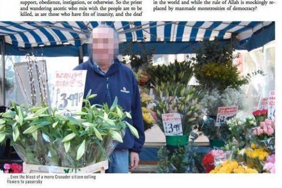 One story stresses that all non-Muslims are valid targets for jihadists, including “businessmen … young adults … and the old man waiting in line to buy a sandwich.” It is illustrated with a picture of a man at what appears to be a British market stall.