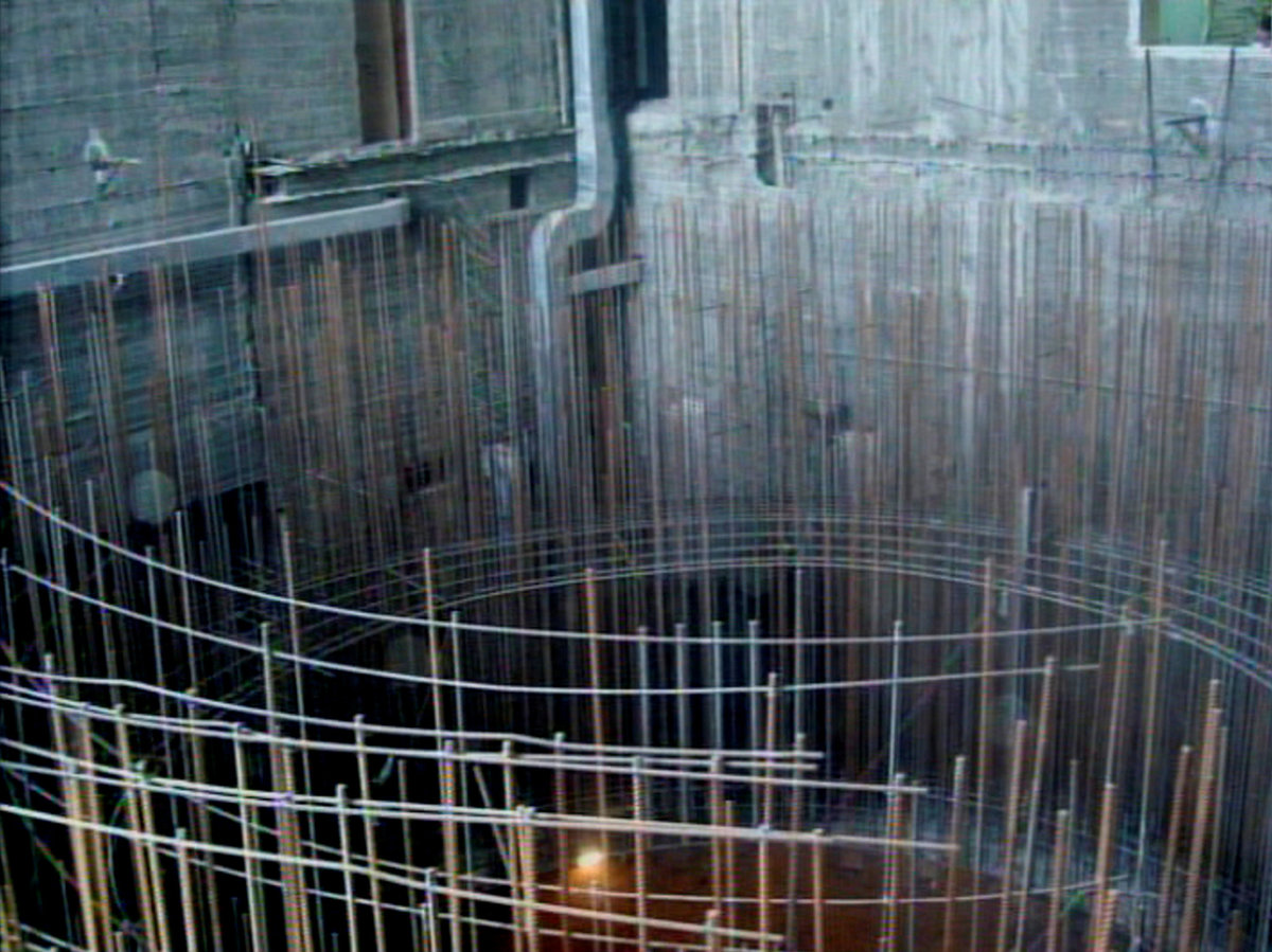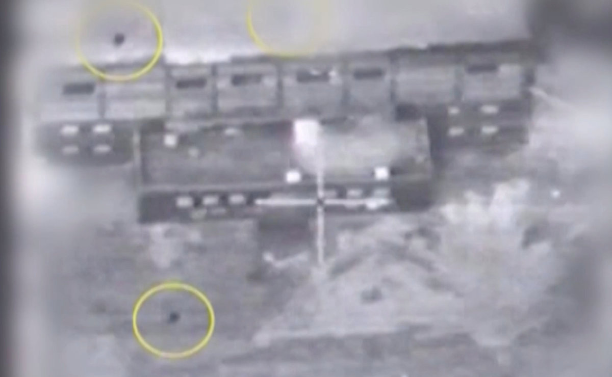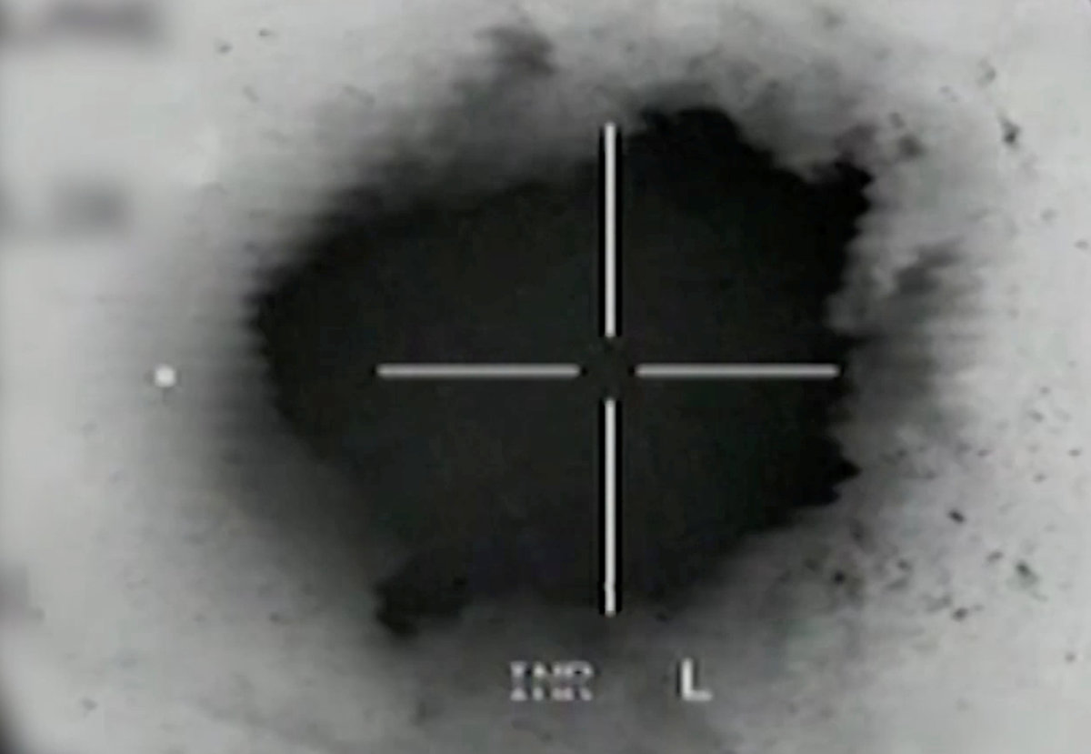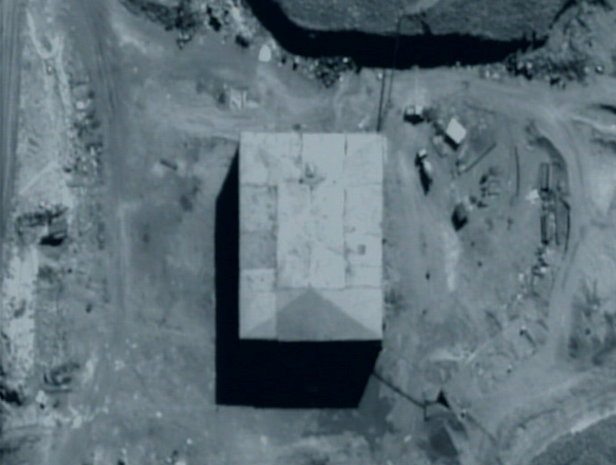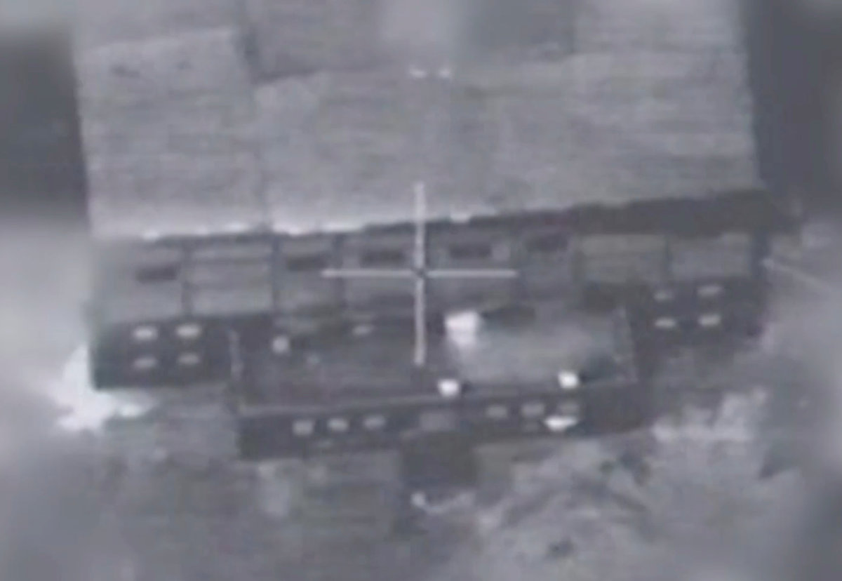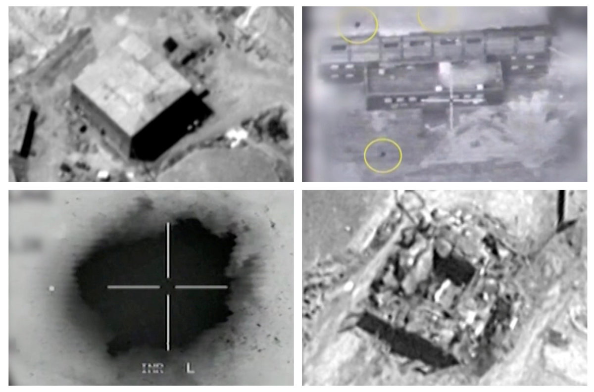 A series of black-and-white videos, taken above the target, shows the structure in cross-hairs. A male voice is heard counting down three seconds, a cloud of black smoke rises from the structure as it explodes. Other footage appears to show the aftermath - a smouldering hole in the ground.