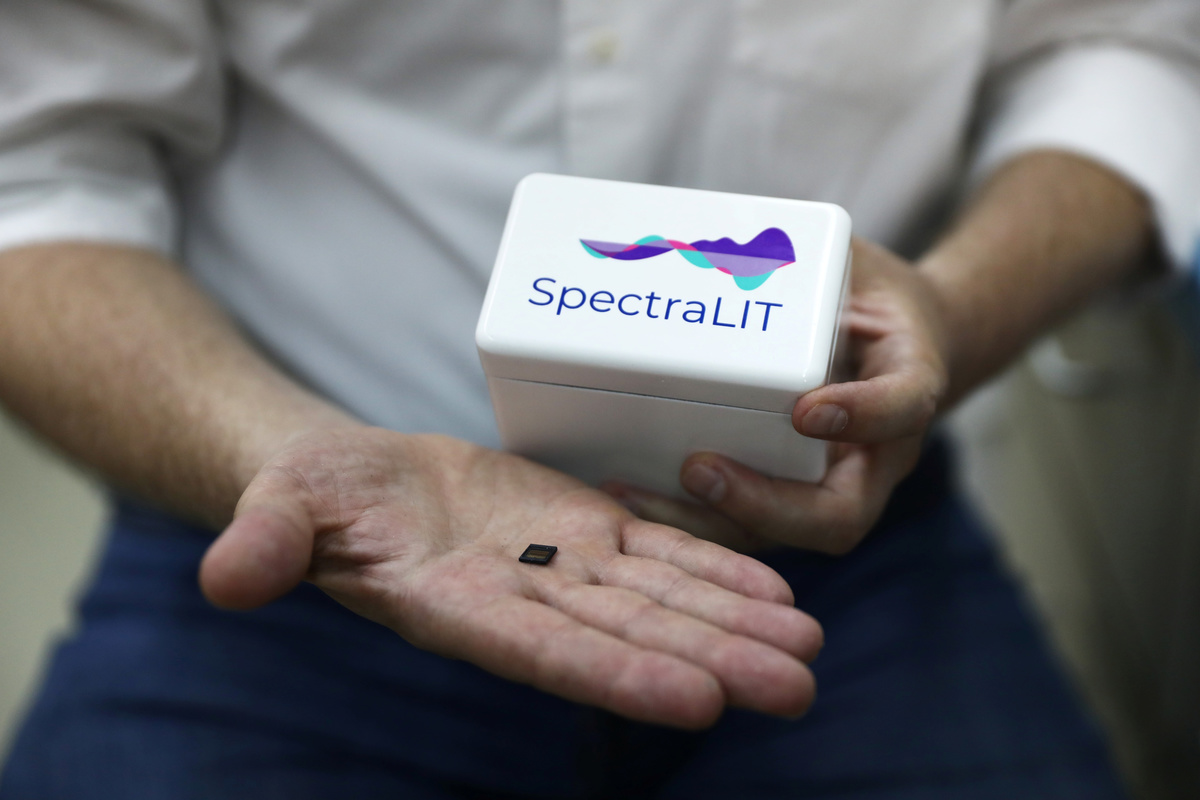 Erez Lev, from Israeli firm Newsight Imaging, holds a chip and a device used in ongoing clinical trials together with Sheba Medical Center, in which they say a newly developed saliva test aims to determine in less than a second whether or not you are infected with the coronavirus disease (COVID-19), at Tel Hashomer in Ramat Gan, Israel August 13, 2020. REUTERS/Ammar Awad