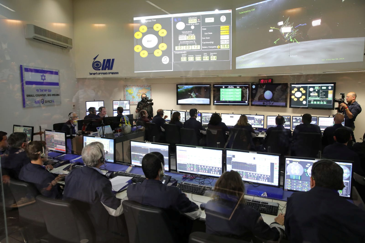 Members of the Israel spacecraft, Beresheet, are seen in the control room in Yahud, Israel April 11, 2019. Courtesy Space IL/Handout via REUTERS