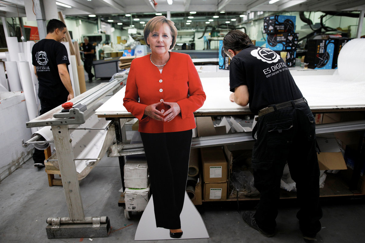 TEL AVIV (Reuters) - Women working in high-tech companies posed around a cardboard cutout of German Chancellor Angela Merkel on Wednesday to protest against a meeting she held with an all-male group of entrepreneurs in Israel last week.