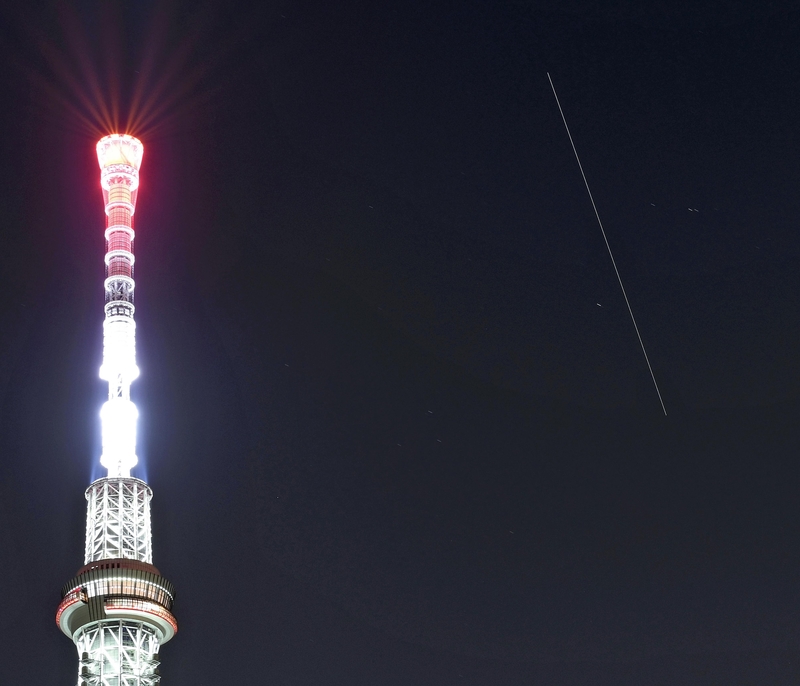 A streak of light from the ISS as it passed the Tokyo Skytree was seen in the southwestern skies of Sumida Ward, Tokyo.