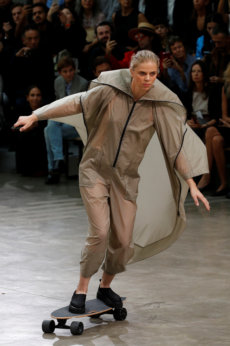 Rather than parading single-file past viewers on a catwalk, Kondo's models twirled around the massive hall in striped "parasol" frocks featuring Issey Miyake's trademark pleats, while others in lightweight nylon raincoats zigzagged on electric skateboards.