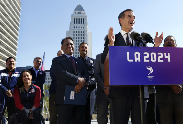 L.A. Mayor Eric Garcetti said Wednesday that Los Angeles appears unlikely to be selected for 2024. But the IOC is making the later date "financially so attractive, we would be stupid not to take 2028," Garcetti said at a BuzzFeed event in Rancho Palos Verdes.