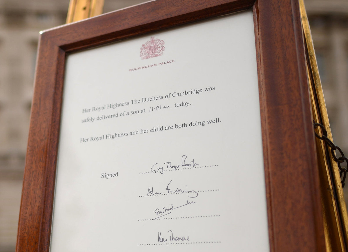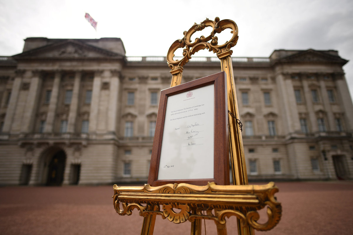 The official announcement of the birth was made by placing a notice on an easel in the forecourt of the queen's London home, Buckingham Palace, a tradition that has been in place since it became the sovereign's official residence in 1837.