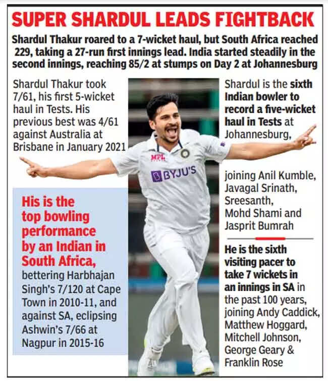 Thakur picked seven wickets to restrict the hosts' first-innings lead to just 27 as the Proteas were bundled out for 229 at the Wanderers stadium on Tuesday.