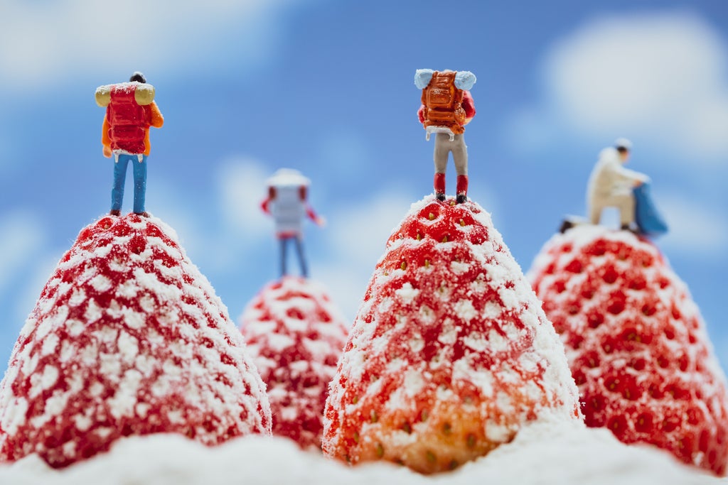 The scenes include figures hiking over a watermelon, spaghetti swimming lanes and abseiling in a bell pepper.