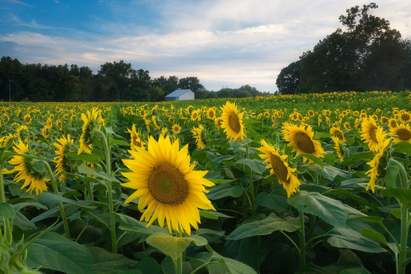 Pockets of Kansas fields of summer are bathed in lush hues of yellow and green. These crop sunflowers should not be confused with the Kansas state symbol, a tinier version called Helianthus annuus, which bloom throughout the summer along roadsides across Kansas.
