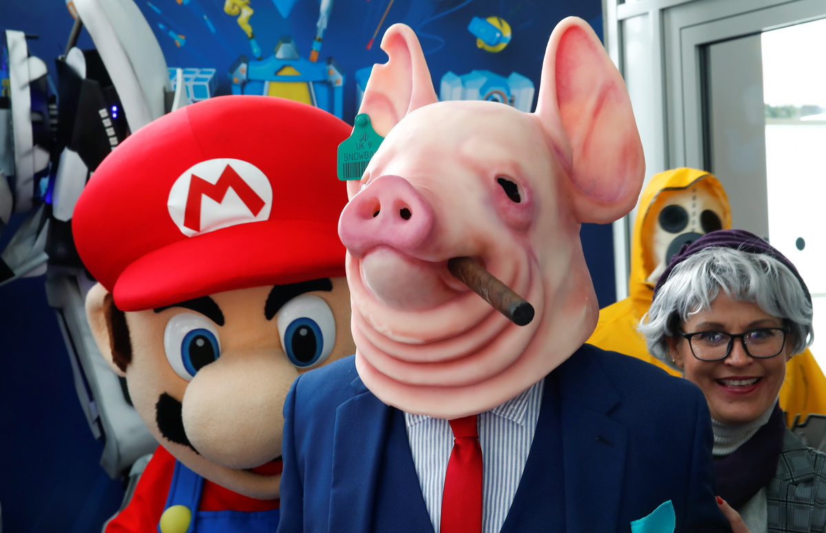 A cosplayer in the costume of Mario stands in front of Gamesbot, the official figure of Europe's leading digital games fair Gamescom, which showcases the latest trends of the computer gaming scene, in Cologne, Germany, August 20, 2019. REUTERS/Wolfgang Rattay