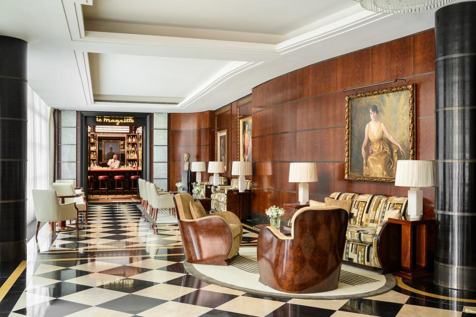 Now moved to its new home, directly off the lobby, Le Magritte Bar is inspired by the American bars that took 1920s Paris and London by storm. Wood-panelling (the entire bar is lined with Fiddleback Cherrywood), cherry-red leather seating and Art Deco lamps give it an authentic period feel. You can take a corner seat to survey the room, or, instead, lean on the leather-topped ebony bar to chat to the white-jacketed barman, and eye up the original Rene Magritte’s oil Le Maitre d’École – after which the bar is named.