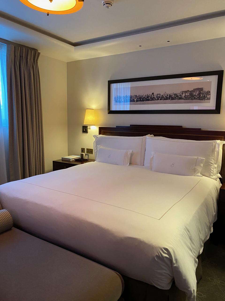 Then, it’s on across the chequerboard-floored lobby, with its oil paintings and mahogany-shell sofas (upholstered in ‘Ellington’, a jazz-age velour fabric). At the lifts, you’ll watch the old fashioned bronze dials signify what floor they’ve reached. By the time, you’ve reached your room, you’ve practically arrived in the golden age of travel.