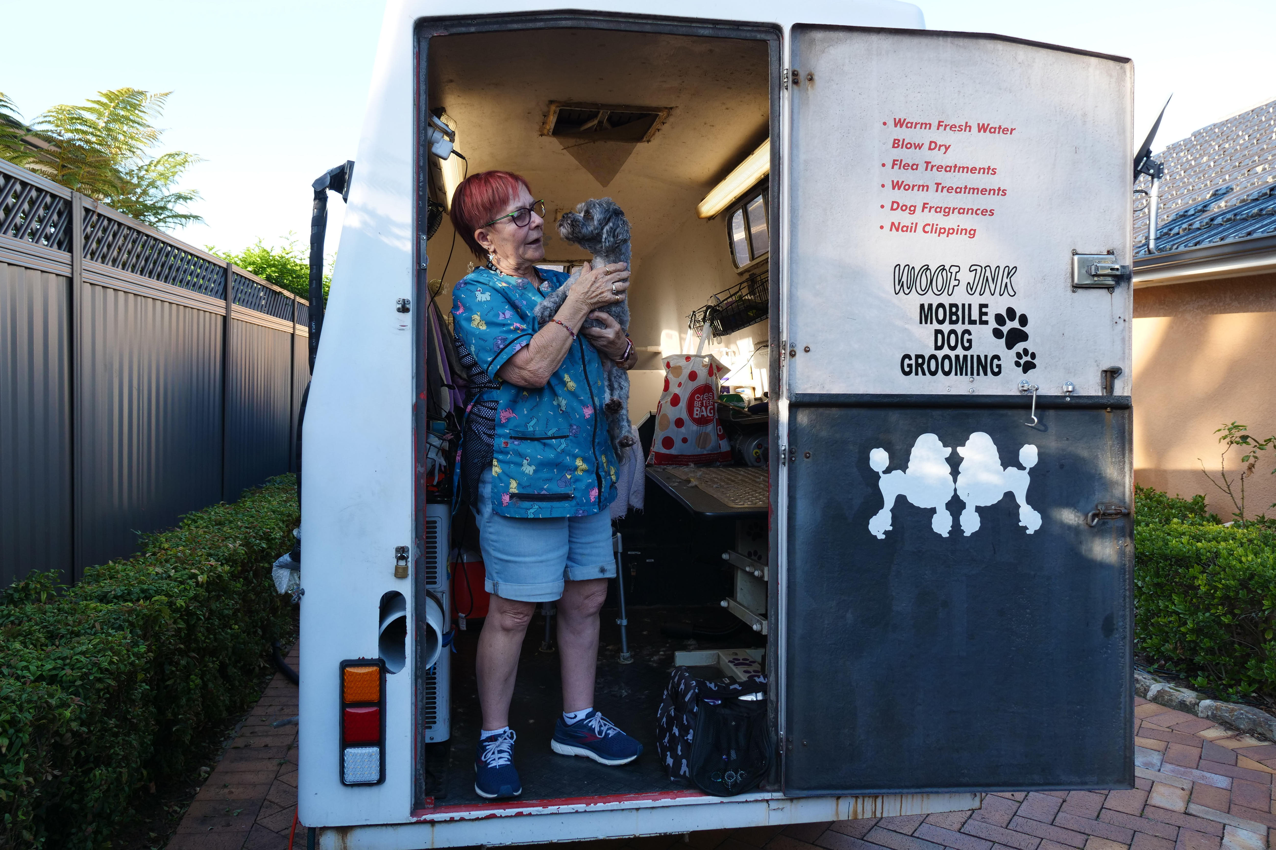 Rather than going out for lunches or watching movies, the 73-year-old is busy crisscrossing Sydney suburbs to wash and clip pet dogs in her trailer.