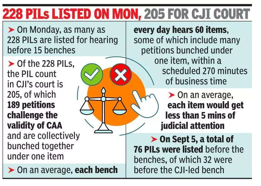 Monday, as many as 228 PILs are listed for hearing before 15 benches. The downpour of PILs is causing a deluge in the CJI’s courtroom, the biggest in the SC. Of the 228 PILs, the PIL count in CJI’s court is 205, of which 189 challenge the validity of contentious Citizenship Amendment Act (CAA) and are bunched together under one item.