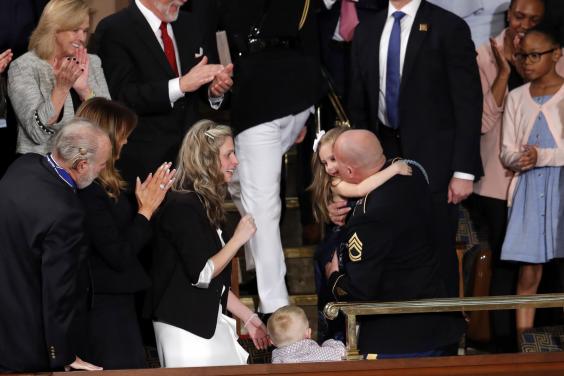 Among them that evening was army spouse Amy Williams and her two children. Mr Trump introduced them to the room towards the end of his speech by commending her for carrying on while her husband, Sergeant Townsend Williams, was deployed in Afghanistan over the past seven months.