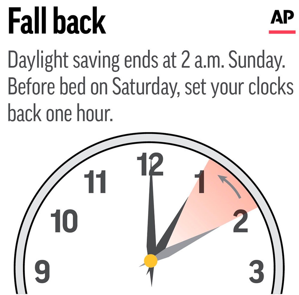 Relish the chance to catch up on sleep and remember to set clocks back an hour before going to bed Saturday night. The time change means darkness will arrive earlier in the evening but it will be lighter earlier in the morning than now.