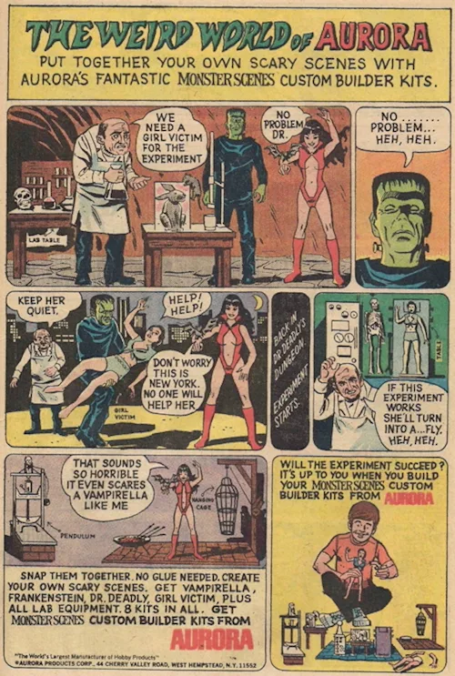 That month, Ohio’s Dayton Daily News ran an upbeat story in which Aurora salesman Tony Mangino labeled the new kits “collector’s items, conversation pieces” and defended calling them toys. “Vampirella can romp bloodily with all her pals in those horror chamber settings,” staff writer Dick Danis offered cheerily, before noting the playability benefit. “When you build a plane, all you can do is wait around for it to break.”