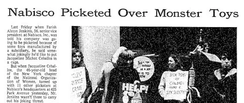 Finally, on November 15, three groups — Parents for Responsibility in the Toy Industry, Women Strike for Peace, and the National Organization of Women (NOW) — sent representatives to protest in front of Nabisco’s Manhattan offices. One picketer dressed as a hangman, while others carried signs with slogans like “Sick toys for children make a sick society!” Nabisco executives met with a few of the protestors and told them that Monster Scenes had been a terrible embarrassment to the parent company.