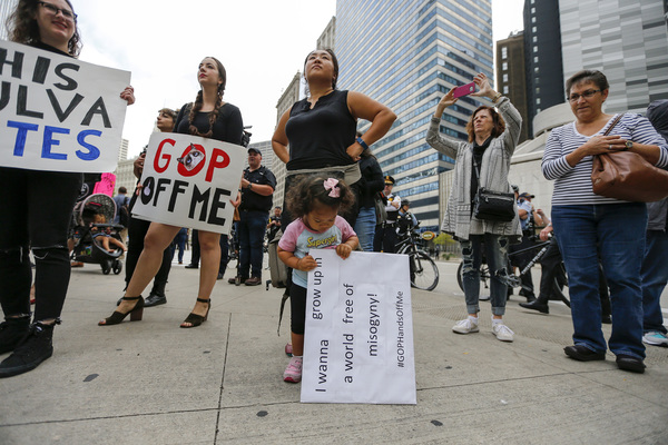 It's an age when women are so fed up with the demeaning attitudes and acts provoked and revealed by this campaign that they take to the streets, as protesters did outside Chicago's Trump Tower on Tuesday, waving signs that mocked the self-styled ladies' man for predatory and debasing remarks he dismisses as locker-room talk.