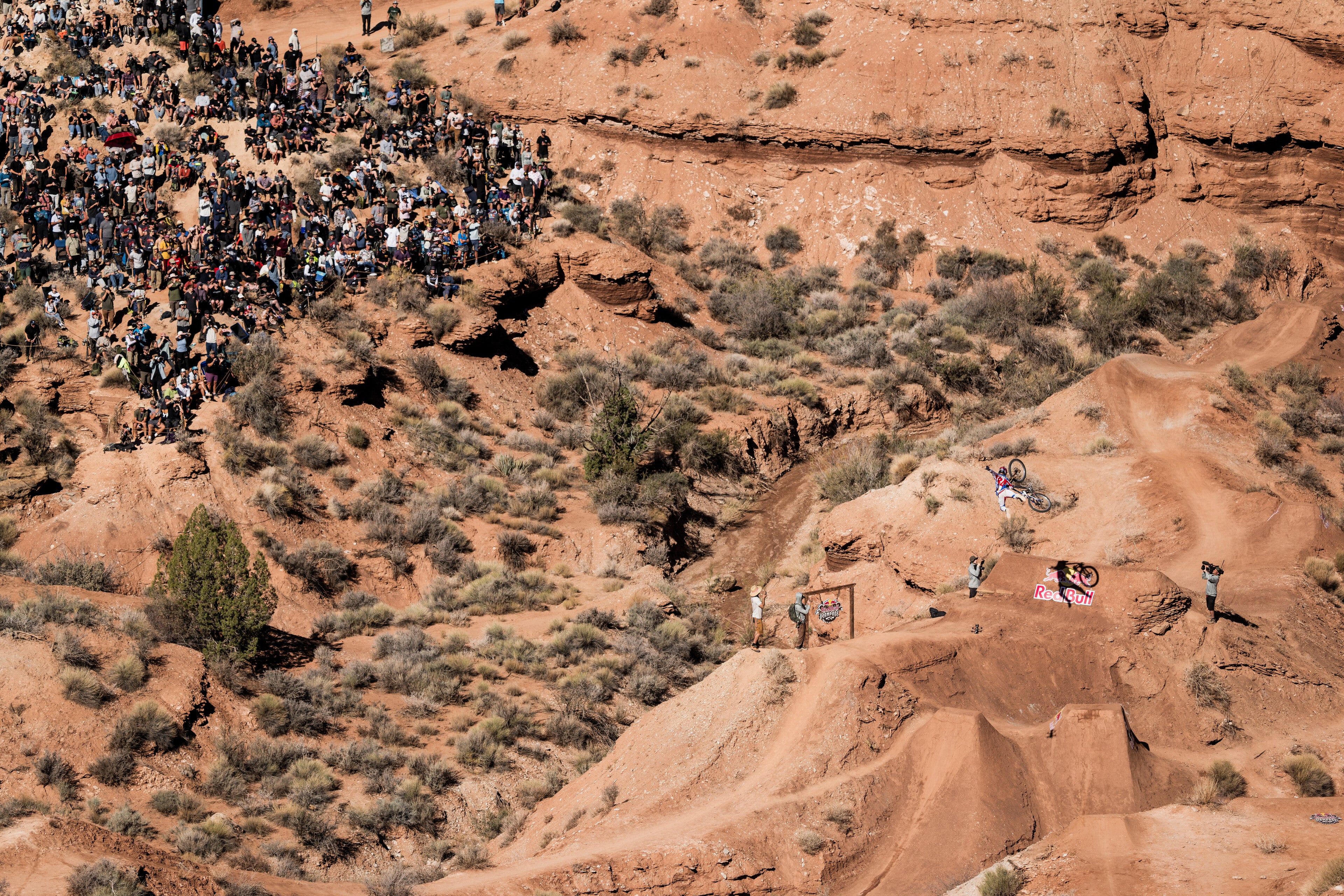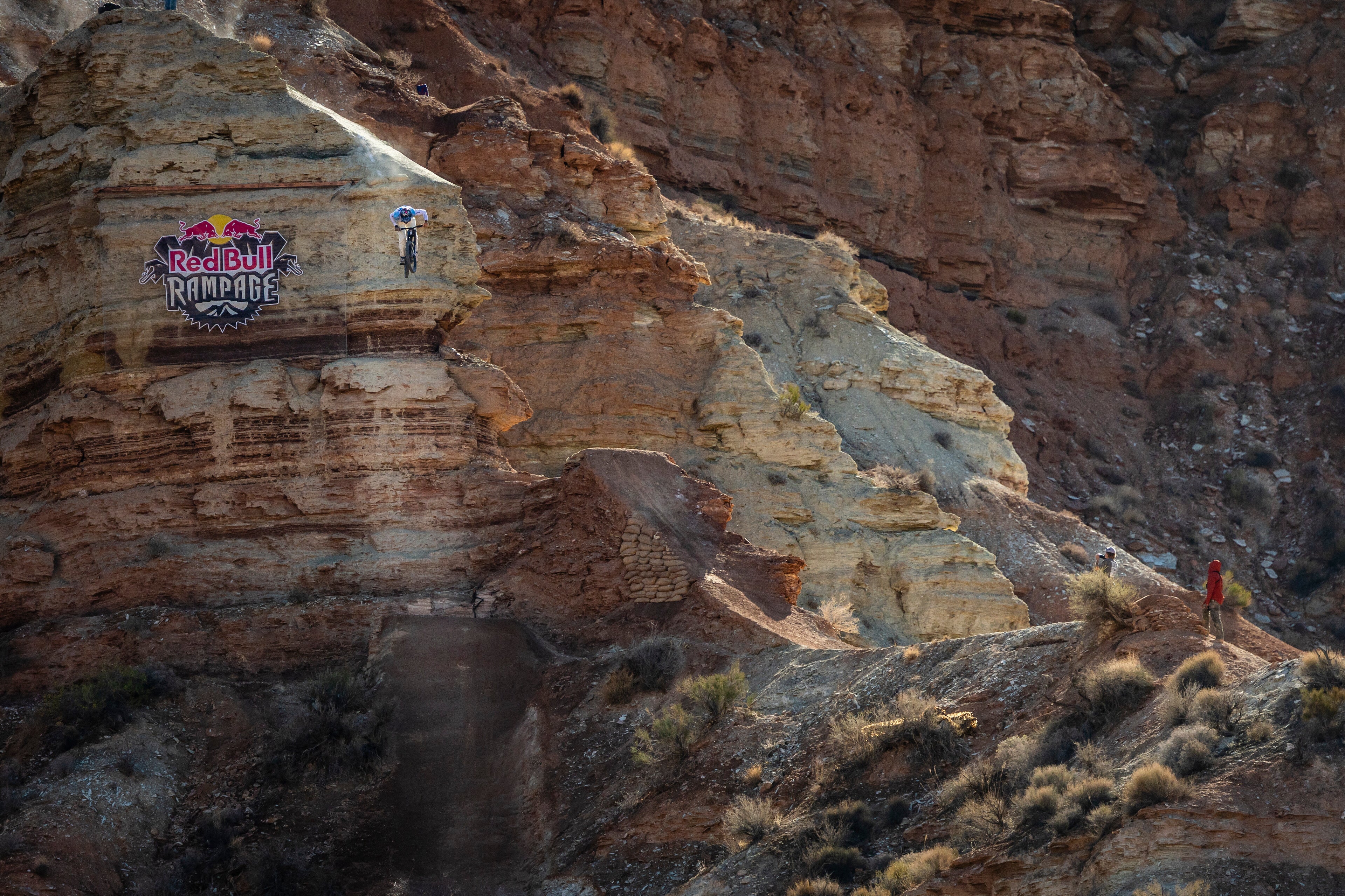 No other bike race in the world is approached by a long hike through the desert, scrambling over rocks and cliffs, following a treacherously narrow path along slick, dusty trails, climbing higher and higher into the desert mountains for a glimpse of the action. But Red Bull Rampage is no ordinary bike race.