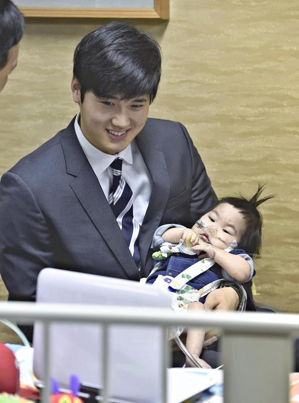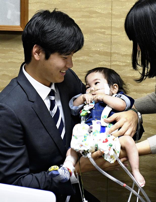 OSAKA -- Los Angeles Angels two-way star Shohei Ohtani visited a 1-year-old baby boy with an intractable heart disease at a hospital in Osaka Prefecture on Saturday, an exchange that was realized after the baseball player learned that the baby had been named after him.