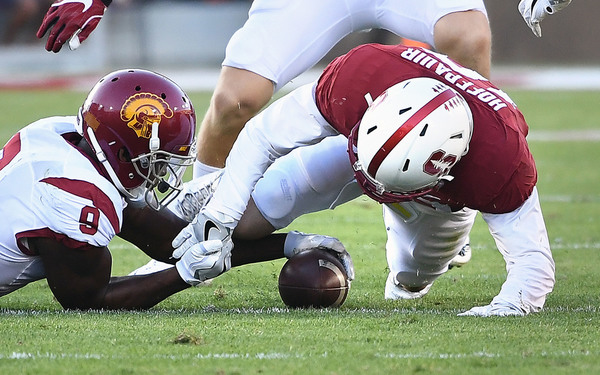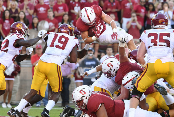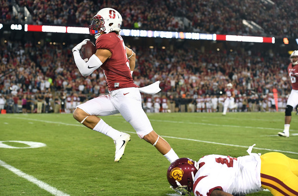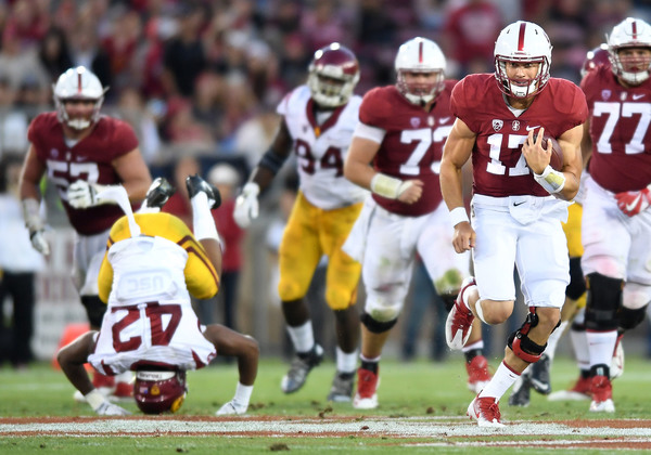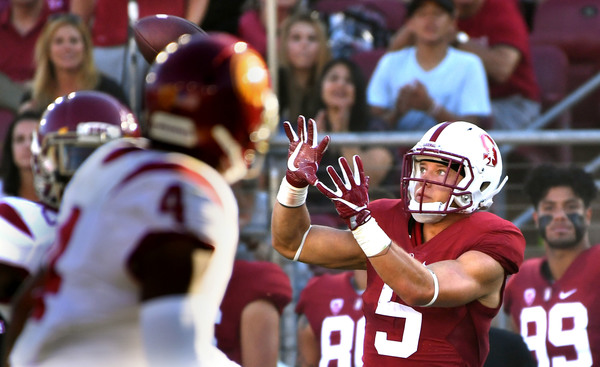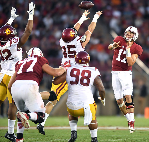 Stanford (2-0) did not score in the fourth quarter, and it did not need to. USC threatened to make a game of it once in the period: a catch went off JuJu Smith-Schuster's hand in the end zone, when a defender appeared to be holding his off hand. Then, on fourth down, Davis tripped over a lineman's leg and fell about a foot short of a first down.