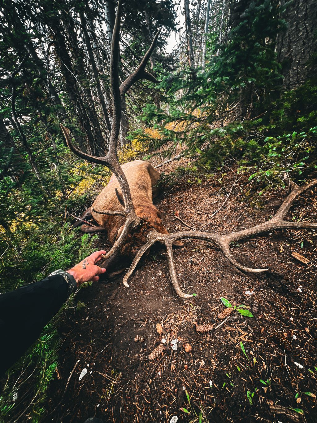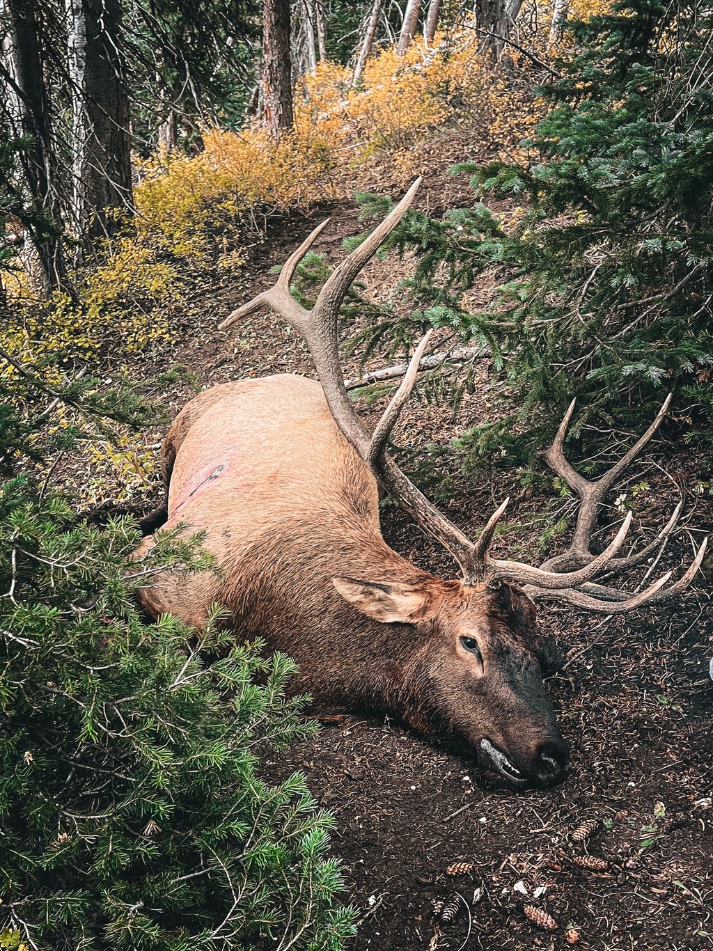 Small specks of blood here, smaller specks of blood there. Deer and elk trails that went nowhere with no dead bull at their ending, and thorn after thorn bush that scratched at every part of me. Then, after 150 yards and down another 100 feet in elevation, I saw his tines through the trees. Again, like my buck last year, I let out a holler of elation that probably was heard ten to twenty miles in radius—apologies to any hunters in the area.