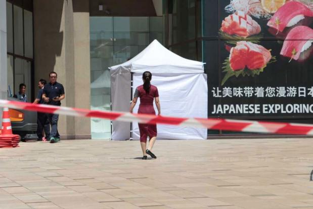 At the scene, mall staff set up a tent to cover the body. Police found the passport of the 57-year-old man who wore only yellow shorts. The body had fractures in the limbs, neck and head.