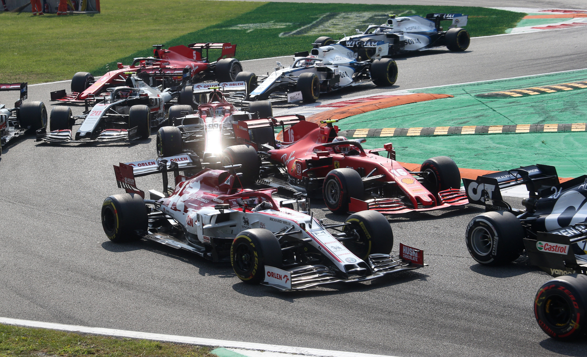 Formula One F1 - Italian Grand Prix - Autodromo Nazionale Monza, Monza, Italy - September 6, 2020 Alfa Romeo's Kimi Raikkonen and Ferrari's Charles Leclerc with drivers during the race Pool via REUTERS/Matteo Bazzi