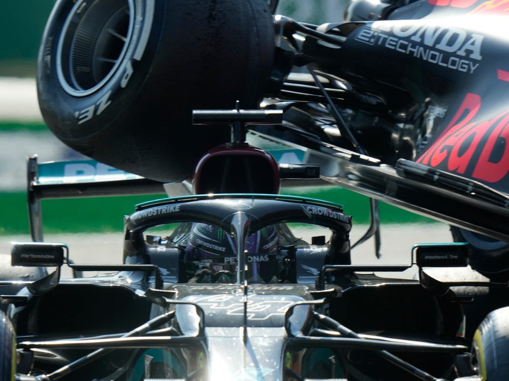 The rear of the Dutchman’s airborne machine ran over the top of Hamilton’s helmet, with the protective halo device absorbing the impact. The front of Verstappen’s Red Bull was then beached in the gravel, and resting on Hamilton’s car.