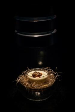 I begin with an amuse bouche of black ink rice cracker with Scottish salmon and ikura, the cracker being inspired by shepherds who ate almost the same thing while tending to their sheep.