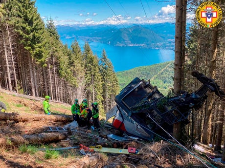 The cable car is believed to have fallen from around 50ft as it took sightseers up Mottarone mountain, which overlooks Italy’s Lake Maggiore.