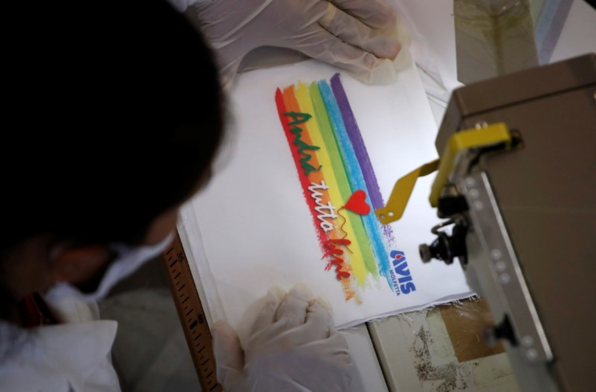 Employees sew protective face masks with the phrase 'andra tutto bene' that means 'everything will be ok', sewn onto them - a phrase that has a symbol of hope as Italy battles a spread of coronavirus disease (COVID-19), in a clothing factory of sisters Barbara, Lisa and Manuela De Virgilio, that usually makes women's fashionwear but now makes solely face masks, in Molfetta, southern Italy, March 25, 2020. REUTERS/Alessandro Garofalo