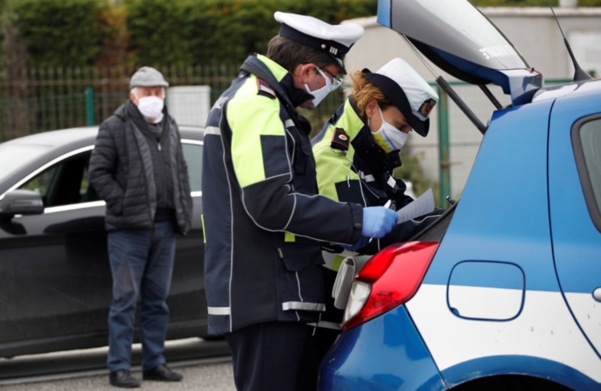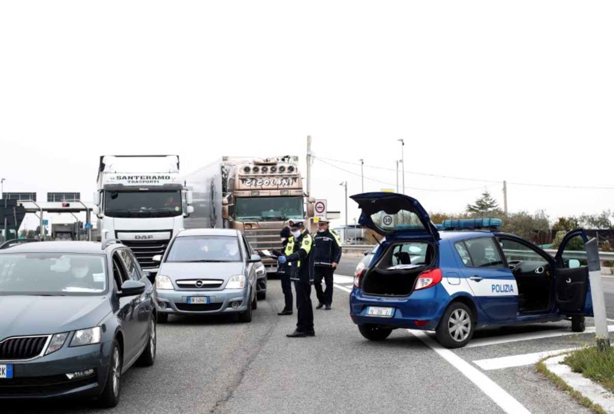Local police officers check on people at the Highway exit for Molfetta, southern Italy, March 25, 2020. REUTERS/Alessandro Garofalo