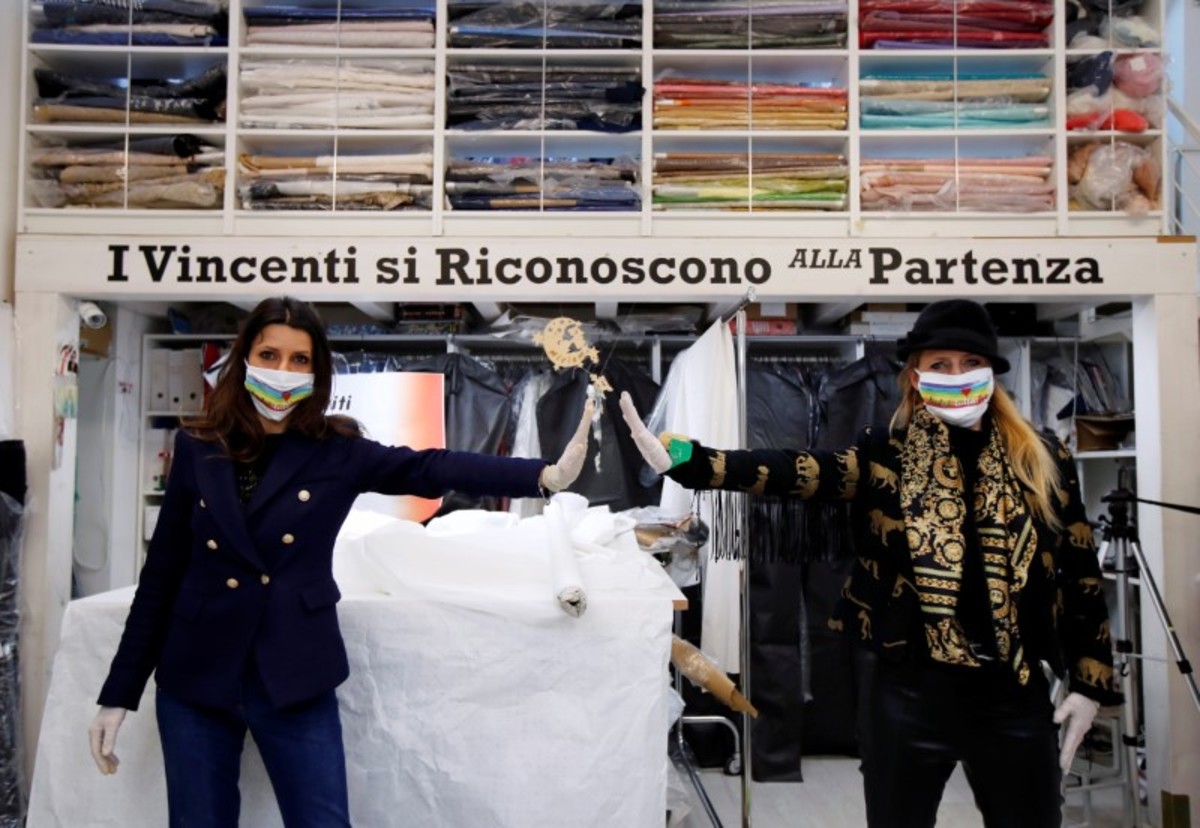 Barbara and Lisa De Virgilio who create protective face masks with the phrase 'andra tutto bene' that means 'everything will be ok', sewn onto them - a phrase that has a symbol of hope as Italy battles a spread of coronavirus disease (COVID-19), pose in their clothing factory that usually makes women's fashionwear but now makes solely face masks, in Molfetta, southern Italy, March 25, 2020. REUTERS/Alessandro Garofalo