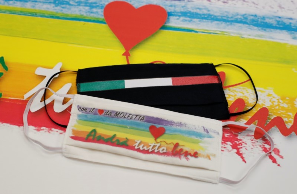 Lisa De Virgilio poses in a protective face mask with the phrase 'andra tutto bene' that means 'everything will be ok', sewn onto it, following an outbreak of the coronavirus disease (COVID-19), in Molfetta, southern Italy, March 25, 2020. REUTERS/Alessandro Garofalo