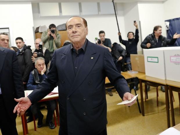Berlusconi's Forza Italia and the anti-immigrant the League (La Lega) each were polling at between 12.5 per cent and 15.5 per cent. They were running as part of a three-party right-wing coalition, which was expected to gather between 33 per cent to 36 per cent of the vote, short of the 40 per cent analysts have said is the minimum needed to secure a majority under Italy's new electoral law.