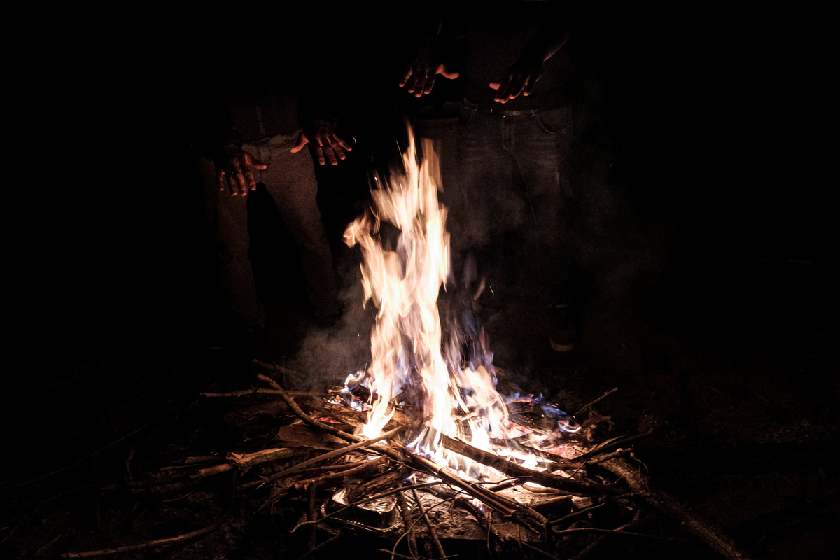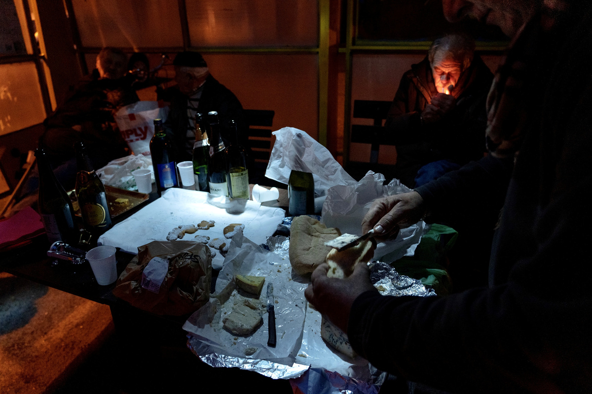 At night, other groups of people meet to eat together in the open air, or at a bus stop. Everyone brings something different: cheese, bread or wine. An impromptu street party takes place with no one wearing masks.