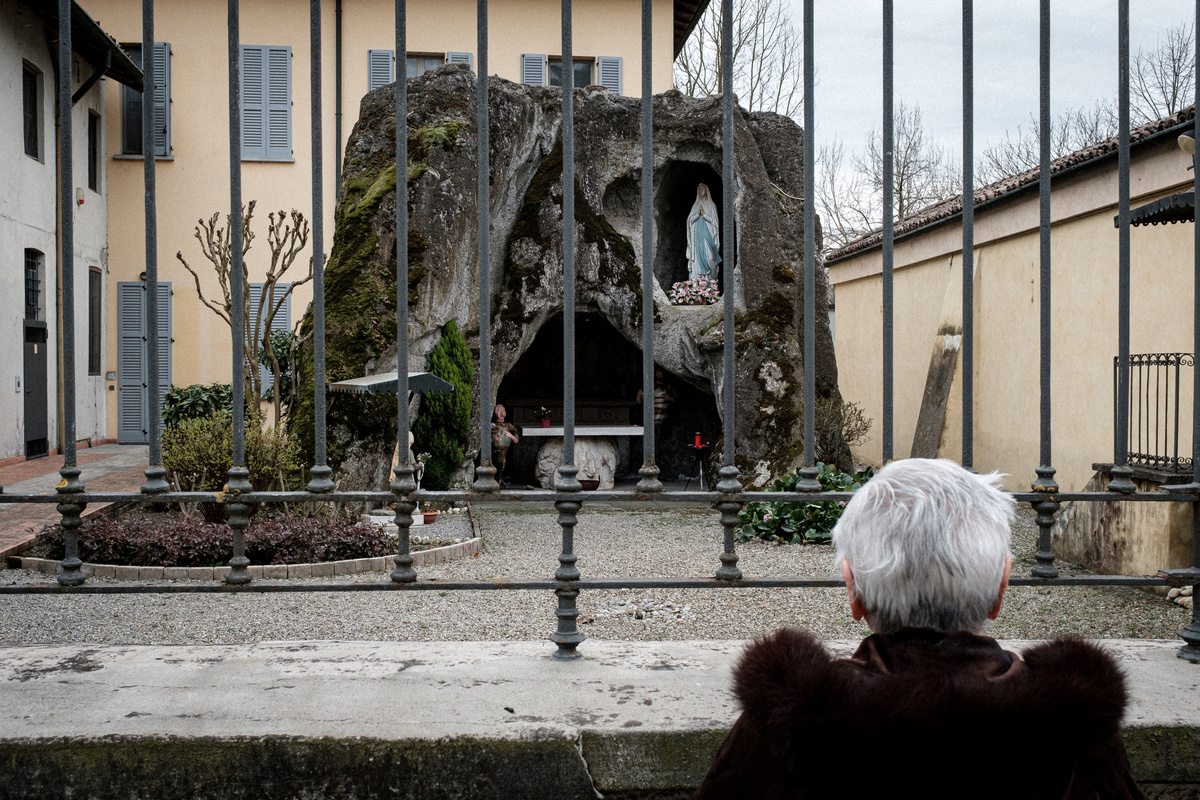 Life inside a red zone: Ines Prandini, 85, prays in front of a sculpture of a replica of the Grotto of Massabielle from outside a fence surrounding her church that has been closed due to a coronavirus outbreak, in this picture taken by her grandson, schoolteacher Marzio Toniolo, in San Fiorano, Italy, February 29, 2020. Marzio Toniolo via REUTERS