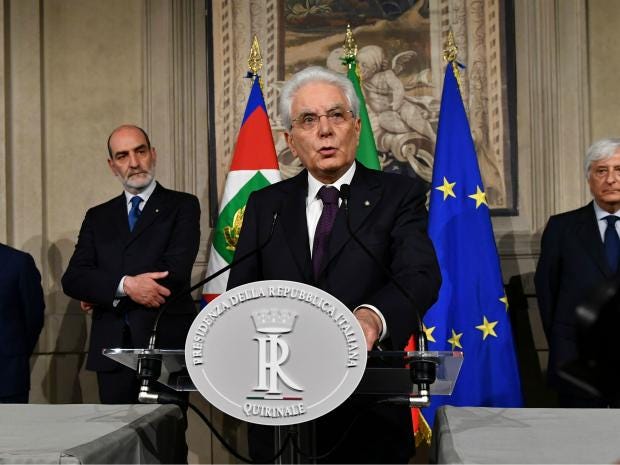 But Italian President Sergio Mattarella told the nation minutes later he had refused to accept the nominee the eurosceptic League and 5-Star Movement parties had put forward for the key economic ministry.