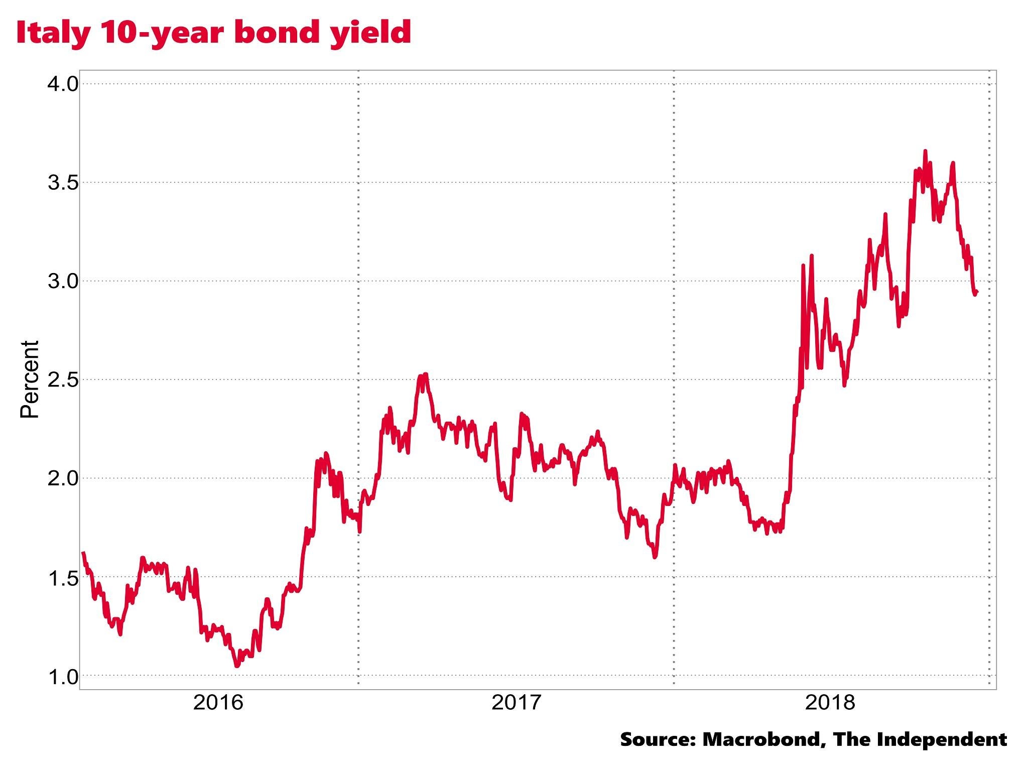 Italian 10-year bond yields spiked to 3.7 per cent in October, the highest since 2014, after the Italian government said it would allow its deficit to rise, threatening to push the government in Rome into another fiscal crisis.