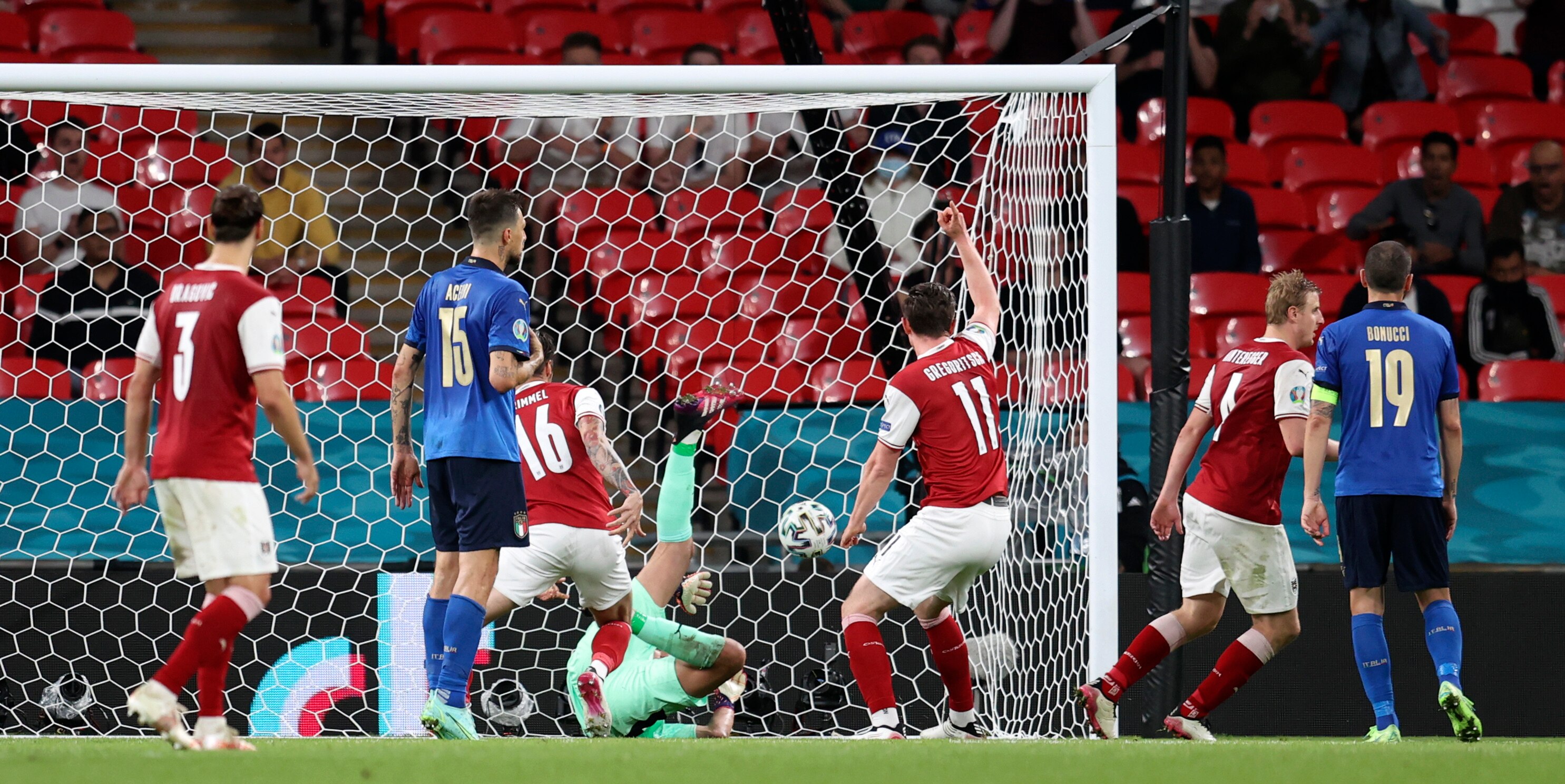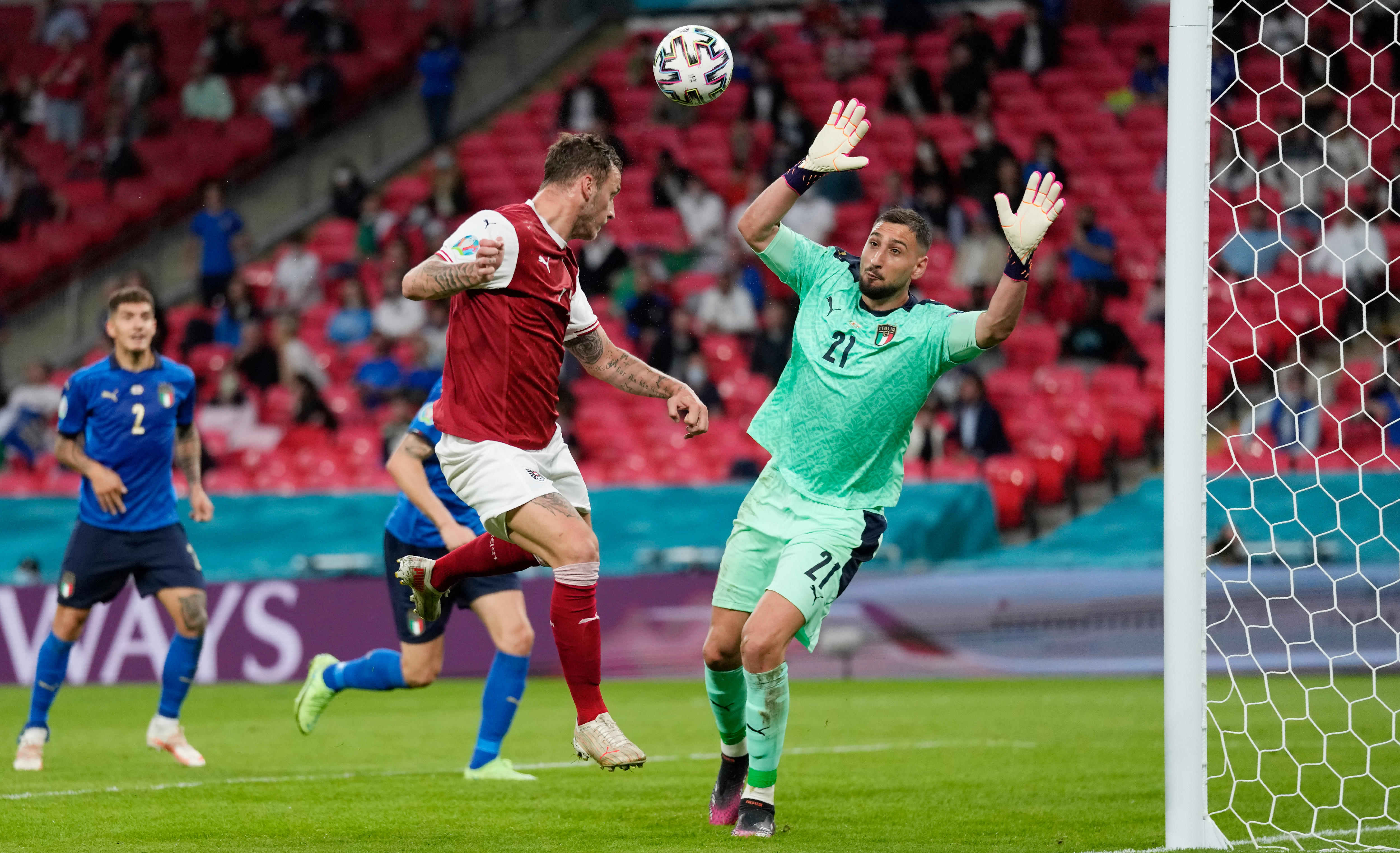 Austria skipper David Alaba curled a free kick just over the bar and it all began to get a little fraught for Italy when Xaver Schlager and Arnautovic both went close.