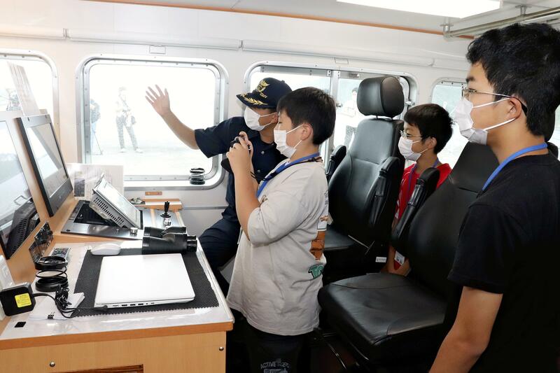 Afterwards, a Kamaishi Coast Guard Office employee taught the students how to make a float out of a plastic bottle in case they fell overboard. They also boarded the prefecture's fishery patrol vessel "Ganju" and observed the cockpit and living quarters. The students looked impressed when they learned that a maritime surveillance camera can detect the movement of a person 5 kilometers away.