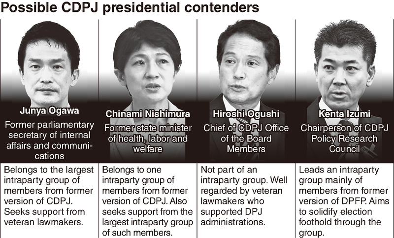 Three other party lawmakers are said to be considering running for the election, with the official start of campaigning on Nov. 19 and voting and ballot counting to be held on Nov. 30. They include Junya Ogawa, a former parliamentary secretary of internal affairs and communications; Chinami Nishimura, a former state minister of health, labor and welfare; and Hiroshi Ogushi, chief of the CDPJ's Office of the Board Members.