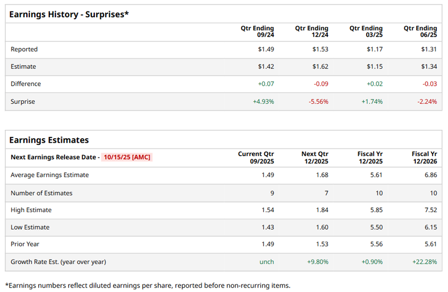 J.B. Hunt Transport Services, Inc. (JBHT), headquartered in Lowell, Arkansas, provides surface transportation, delivery, and logistics services. With a market cap of $12.8 billion, the company transports a variety of products, including automotive parts, department store merchandise, paper and wood products, food and beverages, plastics, chemicals, and manufacturing materials and supplies. The transportation and logistics company is expected to announce its fiscal third-quarter earnings for 2025 after the market closes on Wednesday, Oct. 15.